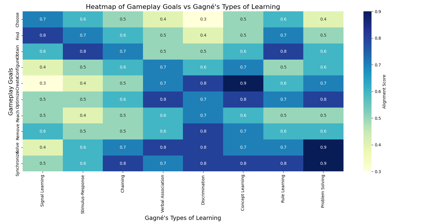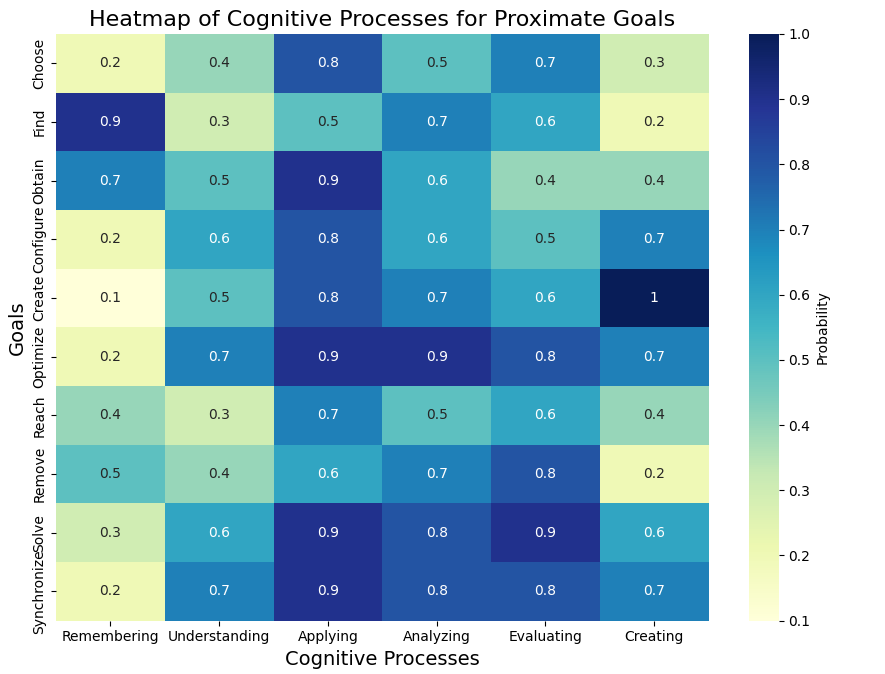 To construct a heatmap for the cognitive processes associated with each of the proximate goals of the Unifying Game Ontology, we will use the previous instruction categories, instructions, and their synonyms as a reference. Each cognitive process will be scored based on how strongly it matches the goal, with probabilities indicating the degree of alignment (e.g., 0.0 to 1.0, where 1.0 is a perfect match).